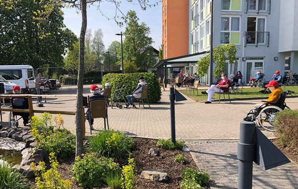 ALTENKIRCHEN – Ein musikalischer Gruß für die Bewohner des DRK Seniorenzentrums AK – Musikalische Angebote können derzeit aus gegebenem Anlass nicht im Café Mocca des DRK Seniorenzentrums angeboten werden. Die Sozialdienstmitarbeiter singen natürlich weiterhin mit den Bewohnern hier und da bekannte Melodien, doch irgendwie freut man sich auch über eine Abwechslung. Ein willkommener Zeitvertreib war es, als Daniela Schwalm anbot, bekannte Melodien auf ihrer Gitarre zu spielen. Durch einen Sicherheitszaum abgeteilt stand der Parkplatz vom Haus zur Verfügung. Aber grenzenlos strahlte die Sonne mit den Zuhörern um die Wette. Schließlich hat man nicht jeden Tag ein Musikangebot unter strahlend blauem Himmel! Bequem auf einem Gartenstuhl sitzend – natürlich mit vorgeschriebenem Abstand zum Nachbarn – oder auch von den geöffneten Fenstern aus lauschte man den bekannten Volks- und Kirchenliedern.  Zum Abschluss sang Daniela Schwalm mit den Bewohnern ein Lied voller Zuversicht und Vertrauen „Von guten Mächten wunderbar geborgen“, und den wohlverdienten Applaus hatte sie zu Recht verdient. Danke an Daniela Schwalm für diesen geselligen Nachmittag! (anar) Foto: DRK Seniorenzentrum AK