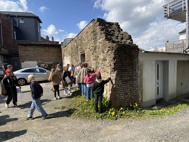 - Foto: Hautnah konnten die Kinder des vierten Schuljahres der Pestalozzi-Grundschule erleben, was es heißt, eine über 1000 Jahre alte Mauer zu berühren. Sie waren begeistert von der kurzweiligen Stadtführung von Christine und Günter. Foto: Werner Klak