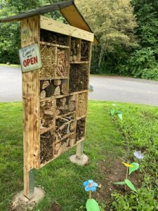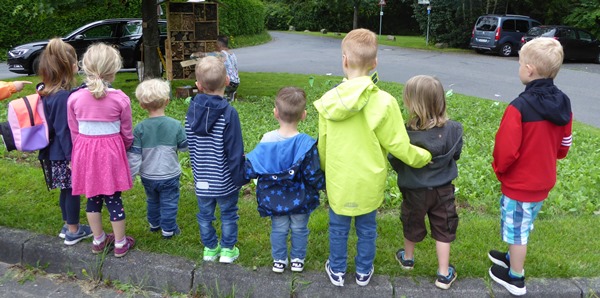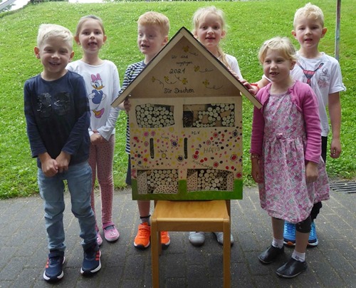 Dann gingen die Überlegungen und Pläne für die Insekten noch weiter: „Mein Papa arbeitet in einer Schule und hat da in der Schule mit den Schülern ein Insektenhotel gebaut und er bringt das zum Kindergarten und das stellen wir vor dem Kindergarten auf die Wiese, wo wir schon Blumen für die Insekten gesät haben.“ In der Woche vor den Sommerferien war es dann auch schließlich so weit. Mit vereinten Kräften wurde das Insektenhotel aufgestellt und für die Insekten zum Einzug freigegeben.