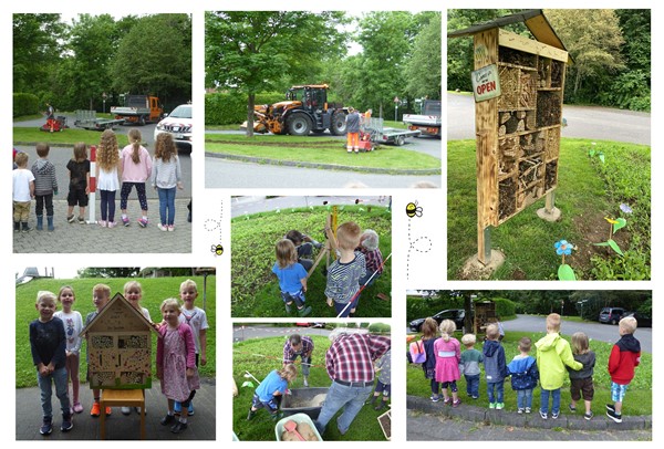 In einem gemeinsamen Projekt mit den Kindern, den pädagogischen Fachkräften, einigen Eltern sowie den Gärtnern des Bauhofs der Verbandsgemeinde Altenkirchen-Flammersfeld entstanden Bienen- und Insektenwiesen mit Insektenhotels – ein „Place to be(e)!“