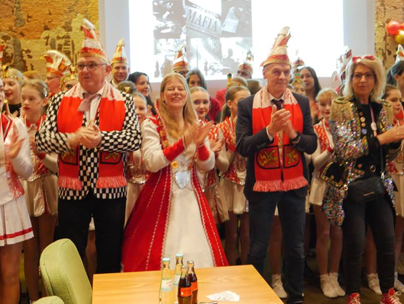 Im Anschluss zog die närrische Gesellschaft in den Ratssaal, wo die feierliche Schlüsselübergabe durch Stadtbürgermeister Ralf Lindenpütz stattfand. Doch damit nicht genug: Auch die KG Burglahr stattete dem Rathaus einen Besuch ab. Mit dabei waren Prinzessin Rowena, Kinderprinzessin Alissia, die Hofdamen Britta und Beate, Präsidentin Svenja Becker, Nicole Sessenhausen sowie der Erste Vorsitzende André Wilsberg. Begleitet wurden sie von einer Abordnung des Hofstaates, des Elferrates, der Garde, der Showtanzgruppe, den Möhnen sowie weiteren Mitgliedern der KG. Ebenfalls vertreten war der HC Erbachtal mit Prinzessin Sina I. und ihrem Gefolge. Unterstützt wurde sie von einer Abordnung des Elferrates sowie den Solomariechen Lana und Leonie.