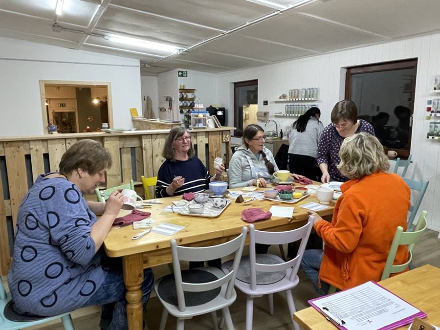 Den Teilnehmerinnen fiel die Auswahl zwischen den vielen Keramik-Rohlingen schwer. Nach einer kurzen Einleitung von Conny Franken ging es dann ans Werk. Es wurde gemalt, getupft, gekratzt, mit und ohne Schablone gearbeitet und die Ergebnisse konnten sich sehen lassen.