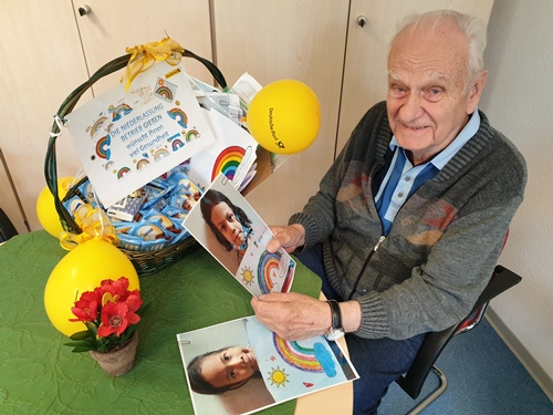 ALTENKIRCHEN – Mit Aktion „Malbogen/Regenbogen“ erfreut die Deutsche Post das DRK Seniorenzentrum Altenkirchen – Ingo Hofmann überraschte mit Begleitung, die Leitung des DRK Seniorenzentrums in Altenkirchen mit einem großen Geschenkekorb voller Schokolade, wichtiger aber mit gemalten Regenbögen und Fotos der Künstler/innen.