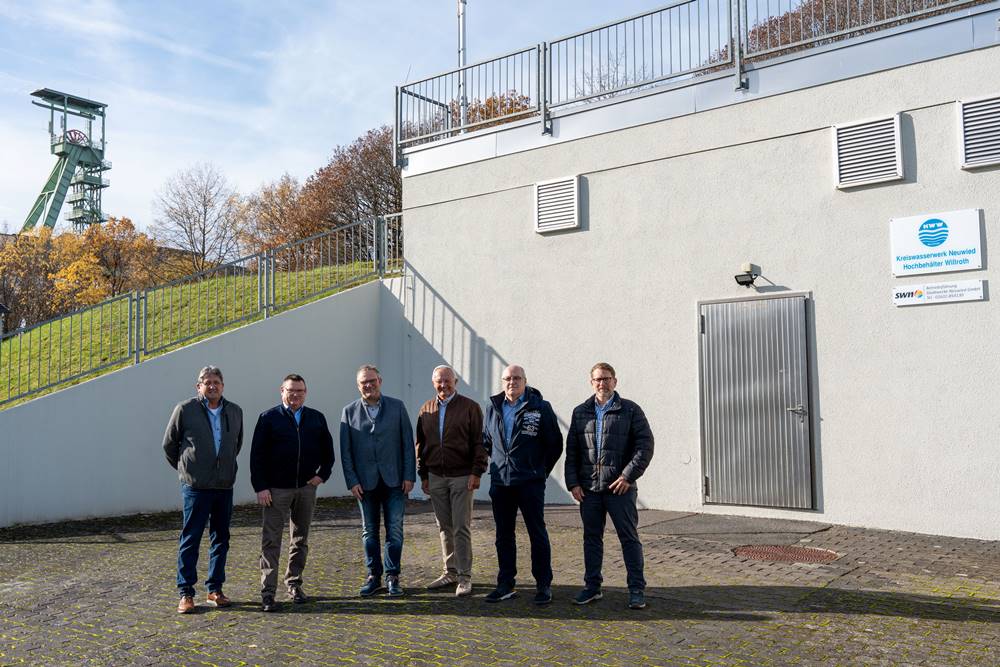 Foto: v.l.: SWN-Prokurist Thomas Endres, SWN-Geschäftsführer Stefan Herschbach, der Verbandsvorsteher des WKA Berno Neuhoff, der Landrat des Kreises Neuwied Achim Hallerbach, der Geschäftsführer der Stadtwerke Wissen Dirk Baier sowie der Technische Prokurist der Stadtwerke Wissen GmbH Manuel Kaiser trafen sich am Willrother Hochbehälter zu einem Informationsaustausch. Foto: Martin Boden / Kreisverwaltung Neuwied.