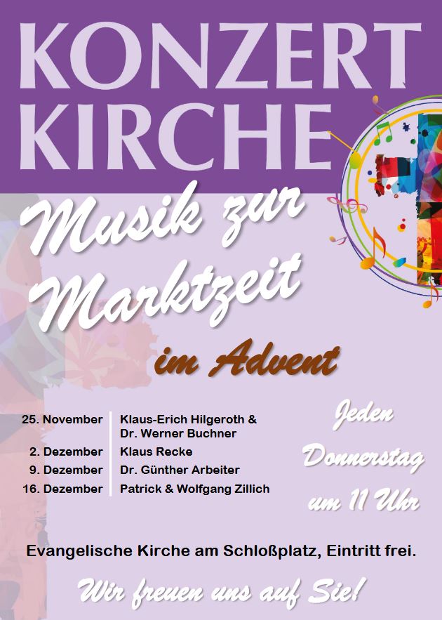 Die beliebte „Musik zur Marktzeit“ in der Konzertkirche am Schlossplatz wird an den Markttagen vom 25. November bis zum 16. Dezember jeweils donnerstags um 11 Uhr stattfinden. So will die Evangelische Kirchengemeinde – trotz Pandemie – an den geplanten instrumentalen Musiken jeweils vor den vier Adventssonntagen festhalten. „Im wieder eingeschränkten Alltag ist es für uns bedeutsam, für jeweils etwa 30 Minuten adventliche Orgelmusik erklingen zu lassen, die zum Innehalten und Zur-Ruhe-kommen einlädt“, meint Martin Schmid, Vorsitzender des Konzertkirchen-Ausschusses.