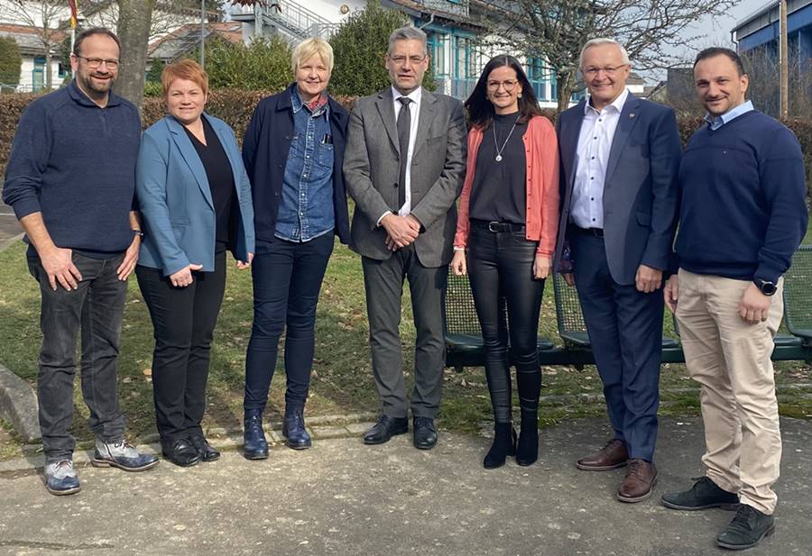 Foto: Das Leitungsteam an der Realschule in Asbach ist wieder komplett. Unser Bild zeigt (von links) FOS-Koordinator Bernd Salzer, die didaktische Koordinatorin Imke Lehleitner, Schulleiterin Sabine Hacker, Regierungsschuldirektor Jörg Kurtscheidt, die pädagogische Koordinatorin Natalie Hees, Landrat Achim Hallerbach (Landrat) und den stellvertretenden Schulleiter Bengjamin Bajraktari.