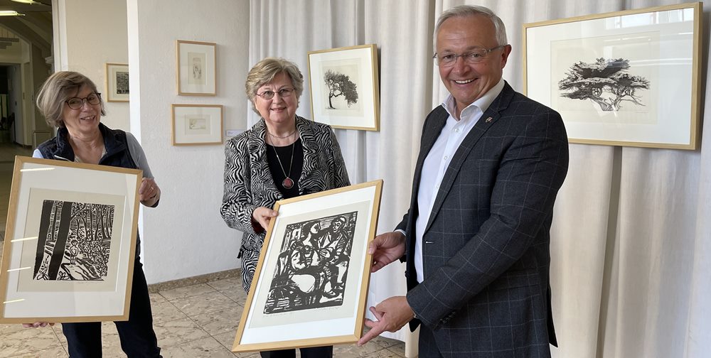 Foto: Malerin Frieda Zander (Mitte) hat etliche Bilder ihrer Sammlung dem Neuwieder Roentgen-Museum geschenkt. Rosina Kusche-Knirsch (links) hat sie zur Freude von Landrat Achim Hallerbach im Kreishaus aufgehängt.
