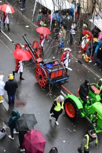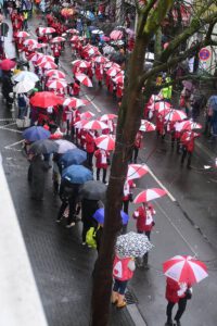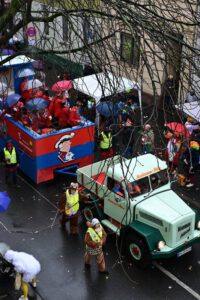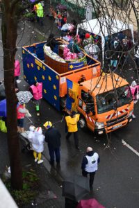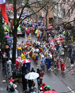 Am Donnerstag, 12.02.2026 schlängelte sich der Weiberfastnachtszug kreuz und quer durch Beuel. Voran um 11.11Uhr die Polizei, die den Zugweg sicherte, gefolgt vom Zugleiter. Am Zug nahmen eine Vielzahl Beueler Vereine teil, von jung bis alt. Die Stimmung am Zug war trotz Wind und anhaltendem Regen ausgelassen und fröhlich.