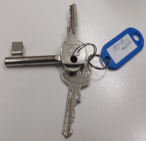 Für die weitergehenden Ermittlungen spielt ein bei ihm sichergestellter Schlüsselbund eine möglicherweise wesentliche Rolle. An dem auf dem Foto gezeigten Bund hängt zusätzlich ein Schlüsselanhänger mit der Aufschrift „Appartement B rechts“.