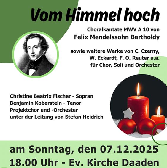 Im Mittelpunkt des Abends steht die Choralkantate „Vom Himmel hoch“ (MWV A 10) von Felix Mendelssohn Bartholdy, die der Komponist bereits als junger Mann im Jahr 1831 über das bekannte Lutherlied schrieb. Inspiriert vom Werk Johann Sebastian Bachs und geprägt durch die Lehrjahre bei Carl Friedrich Zelter, entsteht hier eine kraftvolle und zugleich fein ausgearbeitete Choralbearbeitung. Mendelssohn besetzt die Kantate groß: ein fünfstimmiger gemischter Chor, zwei Solisten sowie ein klassisches Orchester entfalten ein beeindruckendes musikalisches Erlebnis.