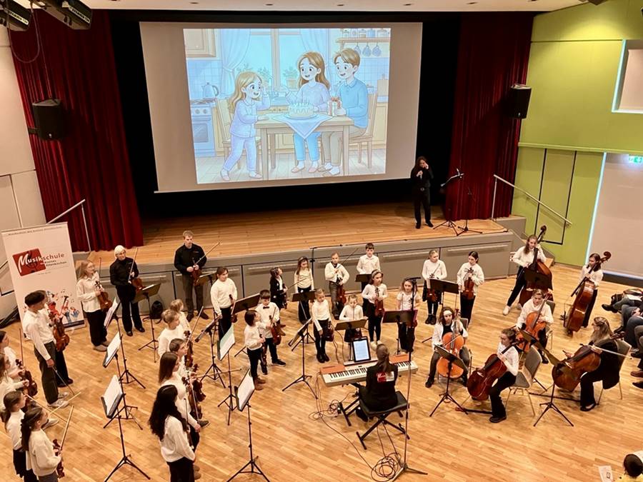 Unter dem Motto „Eine musikalische Geschichte für Kinder und die ganze Familie“ präsentierten 30 Schülerinnen und Schüler des Fachbereichs Streichinstrumente eine lebendige und fantasievoll gestaltete Erzählung. Mit Musik, Bildpräsentationen und einer spannenden Geschichte wurden Tiere wie Elefant, Bär, Antilope und Ameise klanglich zum Leben erweckt und boten so ein abwechslungsreiches Erlebnis für Ohren und Augen.