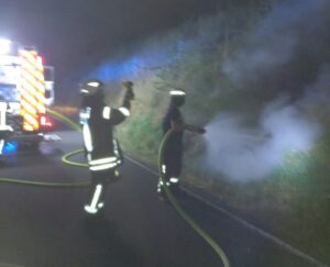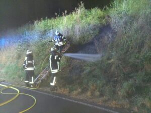 Auch der Montag startete bereits mit Einsätzen für die VG-Feuerwehr. Der Löschzug Steinebach musste gegen 03:45 Uhr zu einem Einsatz „Brandgeruch im Freien“ nach Elben ausrücken. Durch die frühzeitige Wahrnehmung und umgehende Meldung einer Anwohnerin konnte ein sich entwickelnder Böschungsbrand zeitnah gelöscht werden. Auch dort unterstützte wieder die vorsorglich hinzugezogene Drohne mit der Wärmebildkamera aus Rosenheim bei der Erkundung.