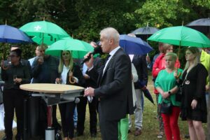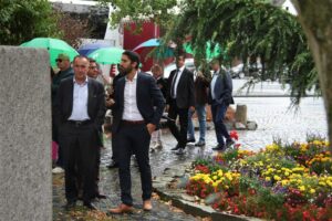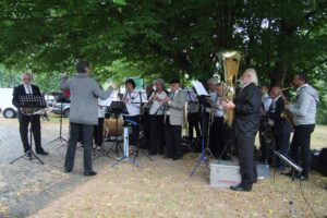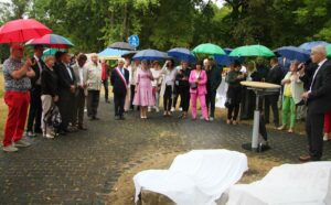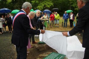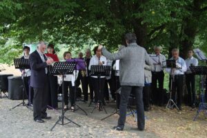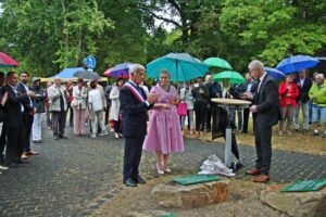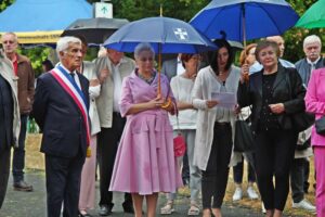 Mit Blick auf die zurückliegenden Wochen, mit den fast unerträglichen Tagestemperaturen, war die Wahl zur Enthüllung der Tafeln in die Vormittagsstunden gut gewählt. Das jedoch ausgerechnet an diesem feierlichen Tag die Sonne sich nicht blicken ließ, sondern dunkle Wolken aufzogen und das lagersehnte Nass zur Erde schickten, war nicht geplant. Für solche Fälle wurde der Regenschirm erfunden und dichte Laubdächer boten ebenfalls Schutz vor dem Nass. Die Musiker „Les Musiciens du Soir“ suchten unter einem solchen Schutz und musizierten einleitend zur Feierstunde.