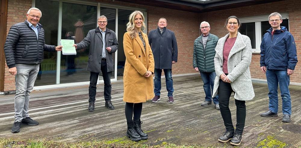 Foto: Landrat Achim Hallerbach (von links) übergab die Baugenehmigung für die neue Kita am Sportplatz an Ortsbürgermeister Franz-Peter Dahl und die drei Beigeordneten Wolfgang Krings, Werner Libske und Johannes Brings. Auf mehr Platz für Kinder und Erzieher freuen sich Bullerbü-Chefin Bianca Bellersheim und ihre Stellvertreterin Ramona Pashaus.