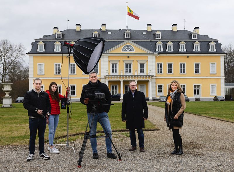 Foto: Oberbürgermeister Jan Einig (2. v. re.) mit Susanne Thiele (re.) bei den Dreharbeiten am Schloss Neuwied mit dem Produzenten Jost Gabriel (mittig) und seinem Team der Agentur newcut, Fabian Wachtler und Annchristin Fischer.