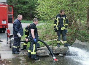 Die Freiwillige Feuerwehr Schönstein, deren Aufgabenschwerpunkt ohnehin die Versorgung mit Wasser ist, verfügt seit kurzem über einen weiteren interessanten Ausrüstungsbaustein. Das ist eine Art Plantschbecken zur Aufnahme von 800 Litern Löschwasser als Füllung für zwei große Löschfahrzeuge. Der Pufferspeicher ist verhältnismäßig einfach auch auf abfallendem Gelände aufzubauen. Den Wulst pumpen die Feuerwehrleute zunächst mit Luft auf, der Rest geht von alleine vonstatten. Das Becken hat seinen Nutzen bereits anlässlich einer Übung unter Beweis gestellt. Es stand bei Neuhöfchen in Richtung Gebhardshain. Für das Verlegen der langen Schlauchleitung vom Selbachstal aus hinauf brauchte man lediglich 40 Minuten. Weiterhin probierten die Schönsteiner hier am Brölbach unterhalb von Mühlenthal eine Schmutzwasserpumpe aus. Sie wird beispielsweise zum Auspumpen von Kellerräumen bei Starkregen gebraucht. (bt) Fotos: Bernhard Theis