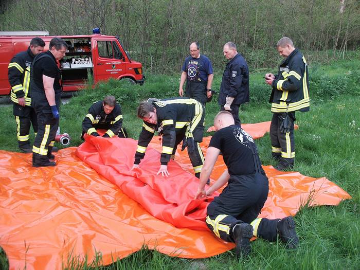 Die Freiwillige Feuerwehr Schönstein, deren Aufgabenschwerpunkt ohnehin die Versorgung mit Wasser ist, verfügt seit kurzem über einen weiteren interessanten Ausrüstungsbaustein. Das ist eine Art Plantschbecken zur Aufnahme von 800 Litern Löschwasser als Füllung für zwei große Löschfahrzeuge. Der Pufferspeicher ist verhältnismäßig einfach auch auf abfallendem Gelände aufzubauen. Den Wulst pumpen die Feuerwehrleute zunächst mit Luft auf, der Rest geht von alleine vonstatten. Das Becken hat seinen Nutzen bereits anlässlich einer Übung unter Beweis gestellt. Es stand bei Neuhöfchen in Richtung Gebhardshain. Für das Verlegen der langen Schlauchleitung vom Selbachstal aus hinauf brauchte man lediglich 40 Minuten. Weiterhin probierten die Schönsteiner hier am Brölbach unterhalb von Mühlenthal eine Schmutzwasserpumpe aus. Sie wird beispielsweise zum Auspumpen von Kellerräumen bei Starkregen gebraucht. (bt) Fotos: Bernhard Theis