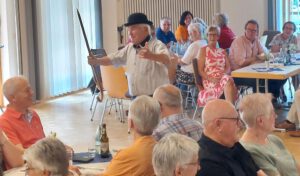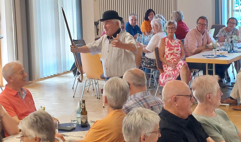 Nach der Ehrung konnte gelacht werden. Erwin Schützeichel, ein Alleinunterhalter der alten Schule, hatte viel zu erzählen. Er machte sich Gedanken über die Vergangenheit, die Zukunft, die Probleme der Enkel mit dem Opa, dem Essen, und dem Verhalten der Menschen in der heutigen Zeit.