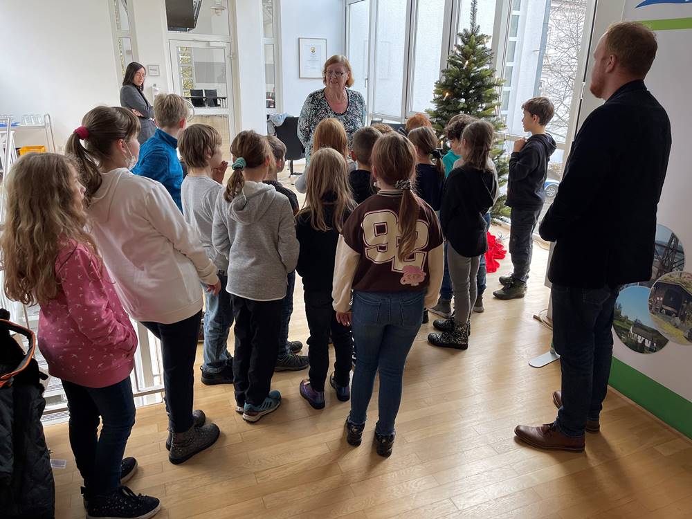 Grundschulkinder schmücken Weihnachtsbaum im Kirchener Rathaus