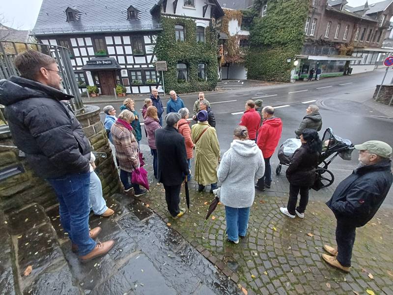Zum Abschluss stand am vergangenen Wochenende das jüdische Leben in Hamm (Sieg) auf dem Programm. Gästeführer Karl-Ernst Stosch vermittelte viele interessante Details zum Leben und dem Schicksal der jüdischen Bewohner im Ort. Seit dem 17. Jahrhundert hatte sich hier eine Gemeinde entwickelt, die Bedeutung zeigte sich Ende des 19. Jahrhunderts durch den Bau einer Synagoge im Ort. Von den Nazis wurde die Gemeinschaft in Hamm (Sieg) dann im wahrsten Sinne ausgelöscht – doch die Erinnerung an die jüdische Bevölkerung wird auf unterschiedliche Weise wachgehalten. Die zweistündige Führung war so interessant, dass alle Teilnehmer trotz des Regens bis zum Schluss den spannenden und bewegenden Ausführungen lauschten. Anschließend gab’s Tee und Kuchen, und mancher nahm noch an der offiziellen Gedenkveranstaltung teil.
