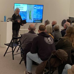 Draußen erinnerten knackige Kälte und frühe Dunkelheit manch einen an früher, als die Westerwälder Winter noch tief und hart waren. Gerne kamen daher die vielen Zuhörerinnen und Zuhörer in das gut geheizte „Haus für die Kunst“ der Stiftung Wortelkamp >im Tal< zum Vortrag des gebürtigen Altenkirchener Biologen, Professor Dr. Christian Hof, „Asphalt, Artensterben und Anthropozän“, sowie Erwin Wortelkamps Erläuterungen zur Rolle der Kunst am Beispiel einer Werkgruppe farbiger Papierarbeiten.