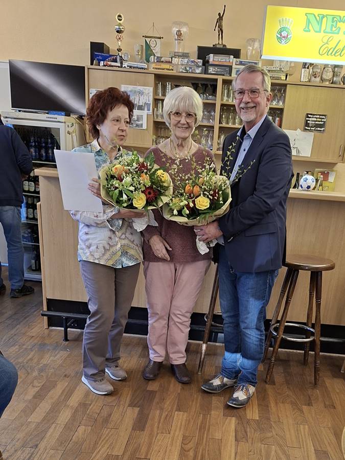 Im Rahmen der jüngsten Versammlung konnten erneut langjährige Mitglieder des Sozialverbandes VdK in Heddesdorf geehrt werden. Vorsitzender Sven Lefkowitz betonte in seiner kurzen Laudatio auf die beiden geehrten Maria Dresen-Gülden und Brigitte Holl, dass der Verband sehr stolz auf seine langjährigen Mitglieder sei. Beide seien bereits seit 20 Jahren dem VdK verbunden. „Das ist keine Selbstverständlichkeit und für das kontinuierliche Wirken eines Verbandes von großer Bedeutung“, sagte Lefkowitz. Brigitte Holl ist seit vielen Jahren auch als Mitglied im Vorstand des Ortsverbandes. Neben der Ehrennadel und einer Urkunde bedankte sich Lefkowitz stellvertretend für den ganzen Vorstand mit einem Blumenstrauß bei beiden Damen für die langjährige Treue und das Engagement für die Gemeinschaft.