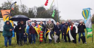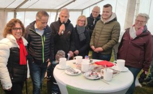 Zur Eröffnung war die Horhauser Prominenz aus Kommunalpolitik, Verwaltung und Geschäftswelt er schienen. Geschütz vor den Wetterunbilden im kleinen Partyzelt begrüßte Bürgermeister Fred Jüngerich Gäste und Akteure. „Die Regenspiele sind eröffnet“. Begrüßung im Zelt und schnell noch ein Gruppenfoto auf der Wiese mit dem Flugdrachen, der in dieser Form auch noch den älteren Generationen in Erinnerung ist. Fotos: Diana Wachow
