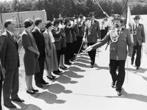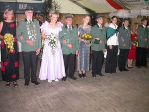 Musikalisch wurde die Krönungszeremonie begleitet durch den Gemischten Chor „Im Grunde“ Oberirsen unter der Leitung von Irmgard Nemitz und dem Vorsitz von Herbert Hassel. Schützen und Fahnengruppe boten ihre Ehrenbezeugung und präsentierten während der Schützenmeister den neuen Majestäten die Würdenketten umhängte. Unter dem Beifall der Thronpaare und der Schützen der anwesenden Gastvereine eröffnete das neue Königspaar Ralf I. und Beate mit einem Walzer den Ballabend. – wwa – Fotos: Archiv BK – Wolfgang Wachow
