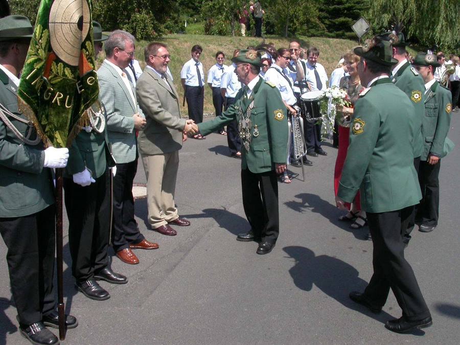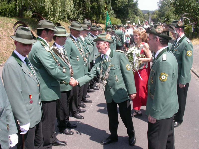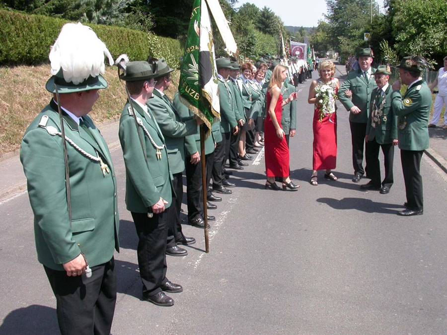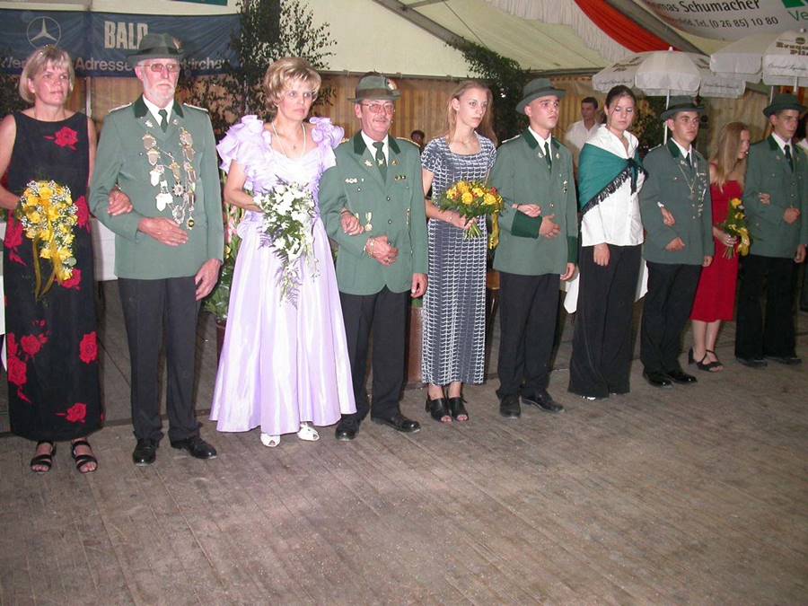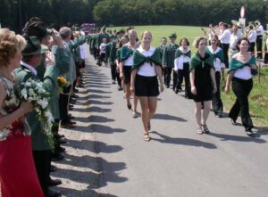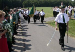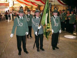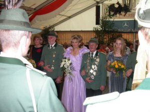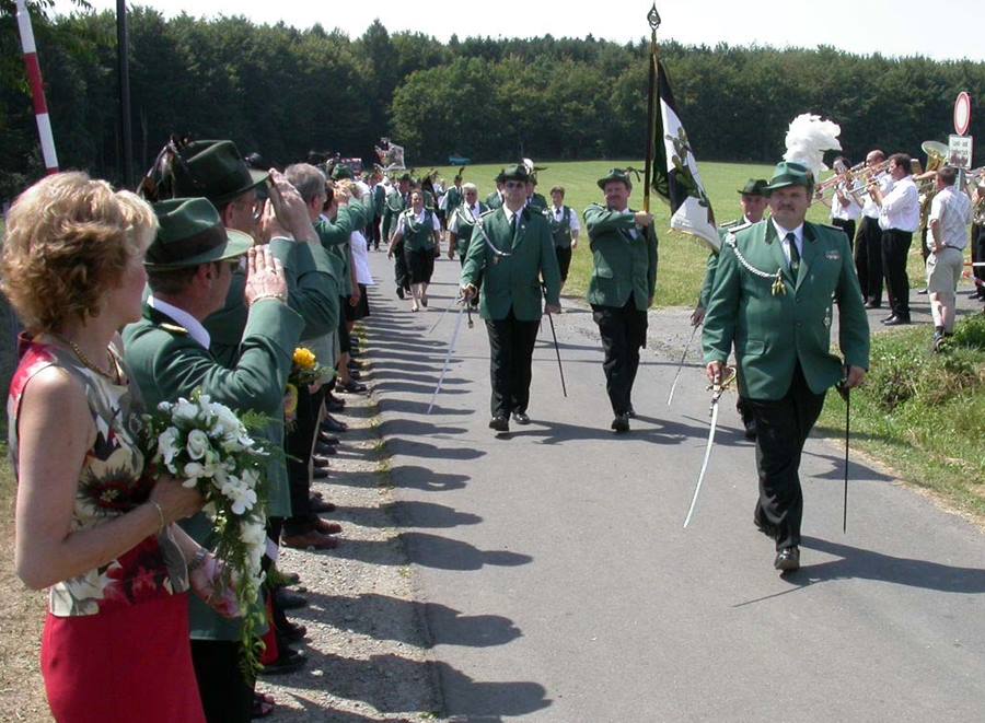 Marenbach 2003 – Die neue Band „SMS“ geleitete musikalisch den neuen und alten Schützenkönig mit Gefolge, Fahnengruppe und Schützen ins hochsommerlich temperierte Festzelt des Schützenvereins „Im Grunde“ Marenbach-Oberirsen.
