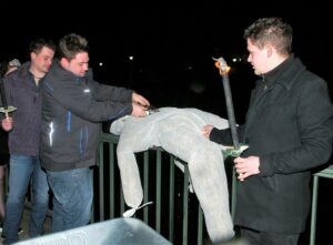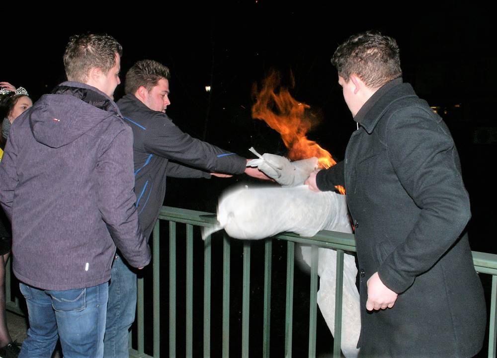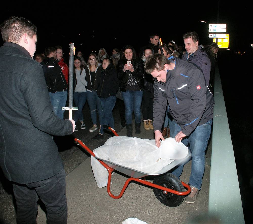 In normalen Zeiten hätte sich am heutigen Mittwochabend ein „Trauerzug“ durch Wissen bewegt. Es galt den Abschied vom Karneval zu „feiern“. Unter Vorantritt des Spielmannszugs „Alte Kameraden“ transportiert man das „Fastowendsmensch“, eine Strohpuppe, per Schubkarre auf die Siegbrücke im Unterdorf, zündet sie an und übergibt sie den Fluten. Dies hat in Wissen eine sehr alte Tradition. So heißt es in einem Augenzeugenbericht auf Wesser Platt aus den Jahren um 1890, dass „En dn Fastelowendsdagen et em Gebroch war, dat en ousgestoppter Kärl, dr Fastelowend, ahn dn Hieronymus Balkon ahngebonnen wur. Der heng do bis Aeschermettwochs Owend, wo er begrawen wur. Als Kend hätt mer sich nex dohenner gesonnen. Awer, als mer grüßer wur, do begreff mer, dat sech dat net gehürte. Wie en Leech trog mer die Poppe ahn die Sehbröcke, machte ein Litanei noh, statt `bitte für uns` sahten die, die drbei woren, `nex för ous`. Dat mer sech dat gefallen leeß en dm dumols noch fast ganz katholischen Wessen! Wohr dat en Spaß ahm Aeschermittwoch?“ So die Worte eines gebürtigen Wisseners, der in seiner Kindheit dem Beerdigen des Karnevals beigewohnt hat, später aber nicht mehr so begeistert von diesem Brauchtum war. Der oben erwähnte „Hieronymus Balkon“ hing übrigens an der gleichnamigen Gaststätte an der heutigen Rathausstraße, Ecke Gerichtsstraße. Später nannte sie sich Gasthof Müller-Inhaber Johann August Hatzfeld. Heute ist nichts davon mehr zu sehen. Als Ersatz für den ausgefallenen „Trauerzug“ hier einige Bilder von 2018. (bt) Fotos: Bernhard Theis