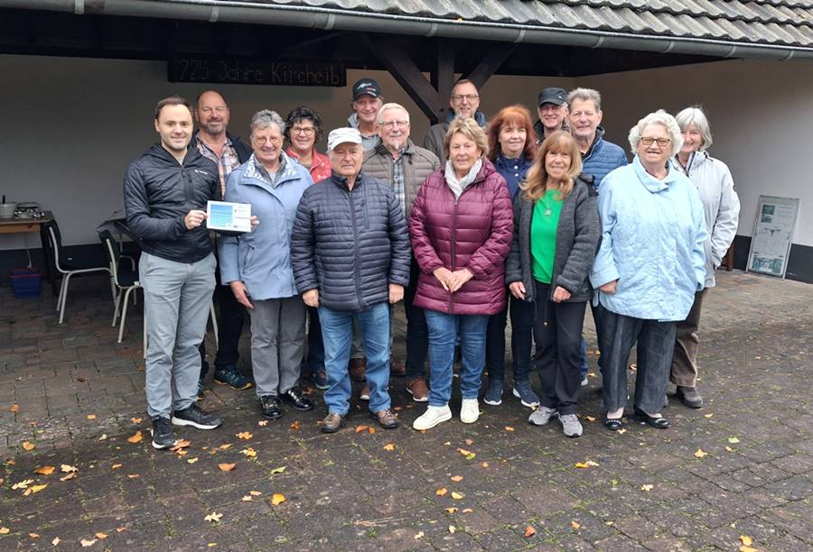 - Foto: Niklas Mäder, Regionalmanager der LEADER-Region Westerwald-Sieg (links), und Ortsbürgermeister Lothar Bellersheim (Mitte) freuen sich gemeinsam mit allen Mitgliedern des Pfingstclubs über den neu renovierten Dorfplatz in Kircheib.