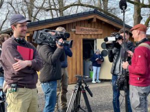 Nach mehreren Telefonaten, Abstimmungen und Vor-Ort-Begehungen stand schließlich der Drehtag fest: 10. März 2026. Pünktlich um 10 Uhr traf ein achtköpfiges Kamerateam des SWR in Kirchen ein. Die ersten Aufnahmen entstanden auf der sogenannten Klickerarena des Vereins in der Kirmesfeldstraße. Dort wurde das traditionelle Klickerspiel vorgestellt und die beiden offiziellen Städte-Paten präsentiert: Bernd Schneider, 1. Vorsitzender des 1. Kirchener Klickervereins und Michaela Stötzel, selbst begeisterte Klickerin und zugleich Gästeführerin für das Druiden.Hexen.Siegerland der Touristik der Verbandsgemeinde Kirchen (Sieg)