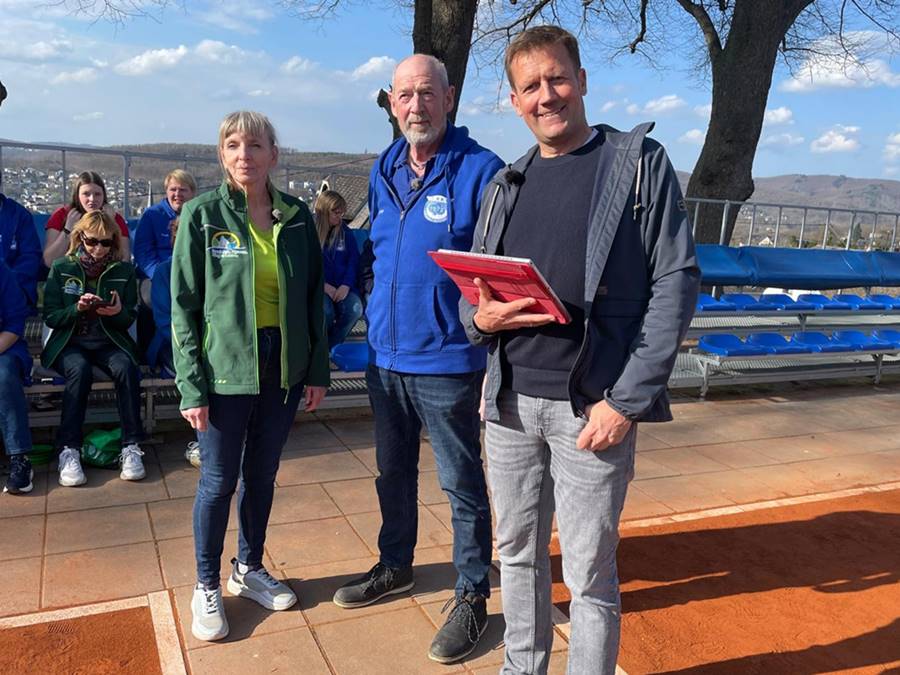 - Foto: SWR-Quiz1: Die Kirchener Städte-Paten Michaela Stötzel und Bernd Schneider mit SWR-Moderator Jens Hübschen (rechts).