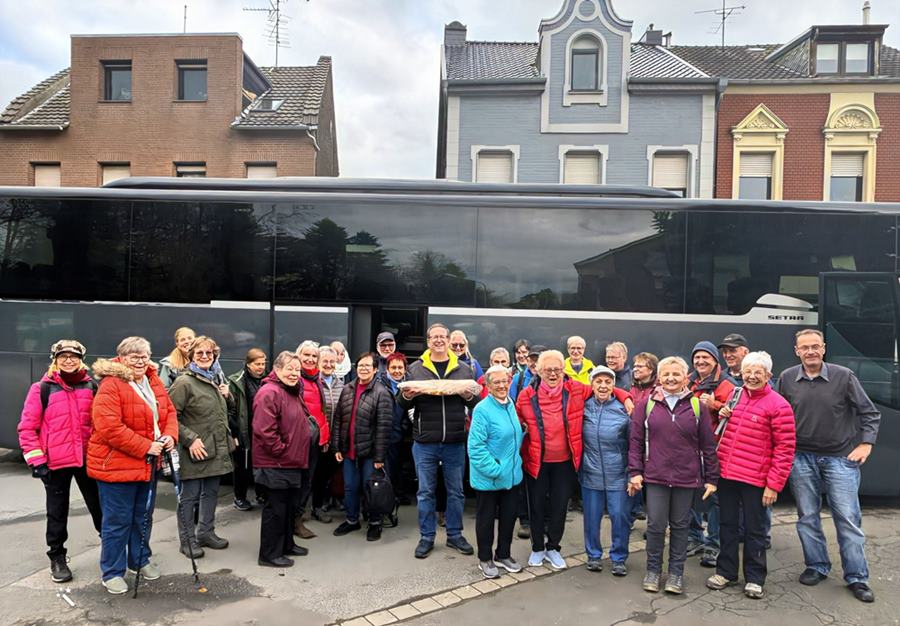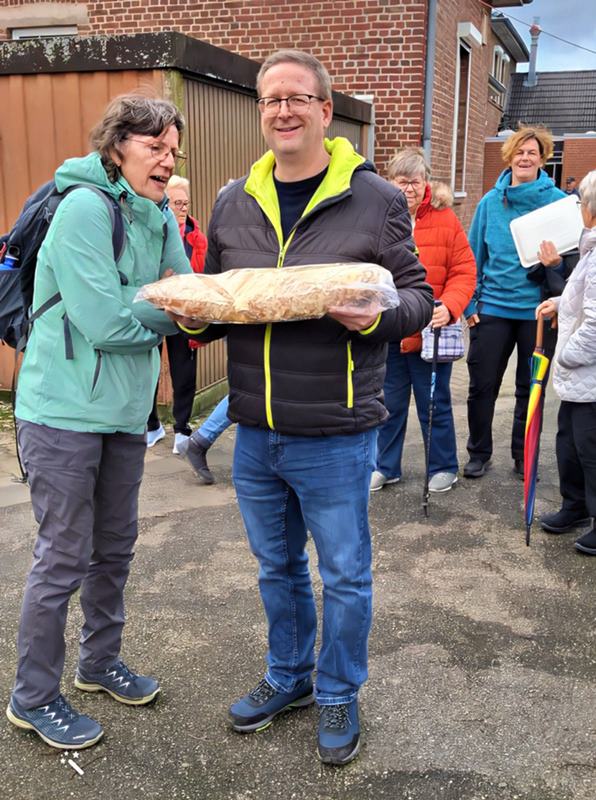 Nach der Rückkehr wartete ein ganz besonderer Moment auf die Gäste aus dem Siegtal: Der Vorsitzende der Wanderfreunde Mönchengladbach e. V., Johannes Kück, überreichte dem Siegperle-Chef Sven Wolff als Dank für die weite Anreise und die Gruppengröße einen riesigen Stutenmann, der eigens angefertigt worden war. Ein beeindruckendes Exemplar – das allerdings die Rückfahrt nicht überlebte. Noch im Bus wurde der süße Gruppenpreis gemeinschaftlich verspeist.