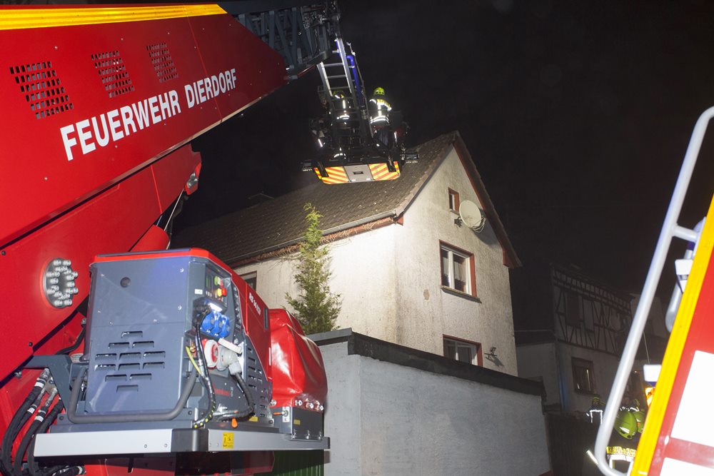 Bei einem Wohnhaus in der Mittelstraße war aus bislang ungeklärten Gründen der Kamin, an dem ein Ofen angeschlossen war, in Brand geraten. Die Drehleiter aus Dierdorf wurde sofort in Stellung gebracht. Parallel kontrollierten die Kräfte aus Kleinmaischeid, die zuerst eingetroffen waren, die Wärmeentwicklung des Kaminzuges im gesamten Haus. Dieser war zwar warm, aber zum Glück nicht überhitzt.
