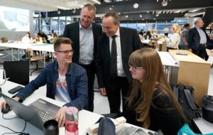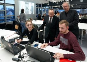 - Wissenschaftsminister Prof. Dr. Konrad Wolf (links) und Prof. Dr. Kristian Bosselmann-Cyran, Präsident der Hochschule Koblenz, im Gespräch mit Architekturstudierenden an ihren neuen Arbeitsplätzen