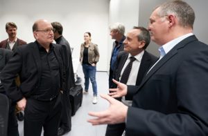 - Prodekan Prof. Dipl.-Ing. Ulof Rückert (links) und Wissenschaftsminister Prof. Dr. Konrad Wolf im Gespräch mit Architekturstudierenden an ihren neuen Arbeitsplätzen