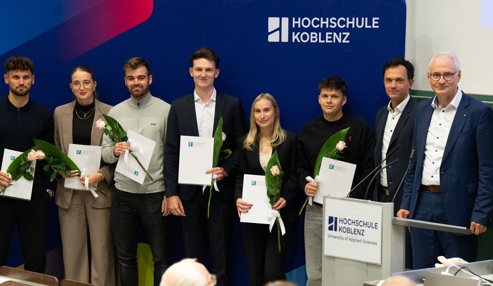 Besonders stolz zeigte sich die Hochschule Koblenz auch über die Vergabe von sechs Sonderpreisen der Deutschen Bundesbank, die von der Hauptverwaltung der Deutschen Bundesbank in Rheinland-Pfalz und dem Saarland zur Verfügung gestellt wurden. Ausgezeichnet wurden Bachelorarbeiten mit einem Preisgeld in Höhe von 1.000 Euro. Über eine Auszeichnung freuten sich die Absolventinnen und Absolventen Kristina Augel, Paul Kaiser, Junis Ashry, Viktoria Brinster, Mark Drinovan und Thomas Weiler. Alle Arbeiten stammten aus dem Fachbereich Wirtschaftswissenschaften und behandelten Themen aus den Geschäftsfeldern der Deutschen Bundesbank. Betreut wurden die Preisträgerinnen und Preisträger von Prof. Dr. Michael Kaul. Michael Schiff, Leiter des Stabes des Präsidenten der Hauptverwaltung in Rheinland-Pfalz und dem Saarland, überreichte gemeinsam mit dem Präsidenten der Hochschule die Preise und gratulierte den Studierenden zu ihren besonderen Leistungen.