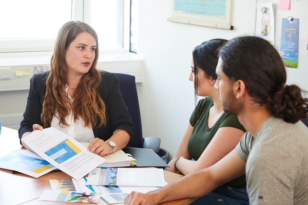 Tielfoto: Anna Hoffmann, Leiterin Internationales des Fachbereichs Wirtschaftswissenschaften, bei Beratung von Outgoing-Studierenden. (Foto: Hochschule Koblenz/Gloger)