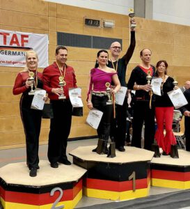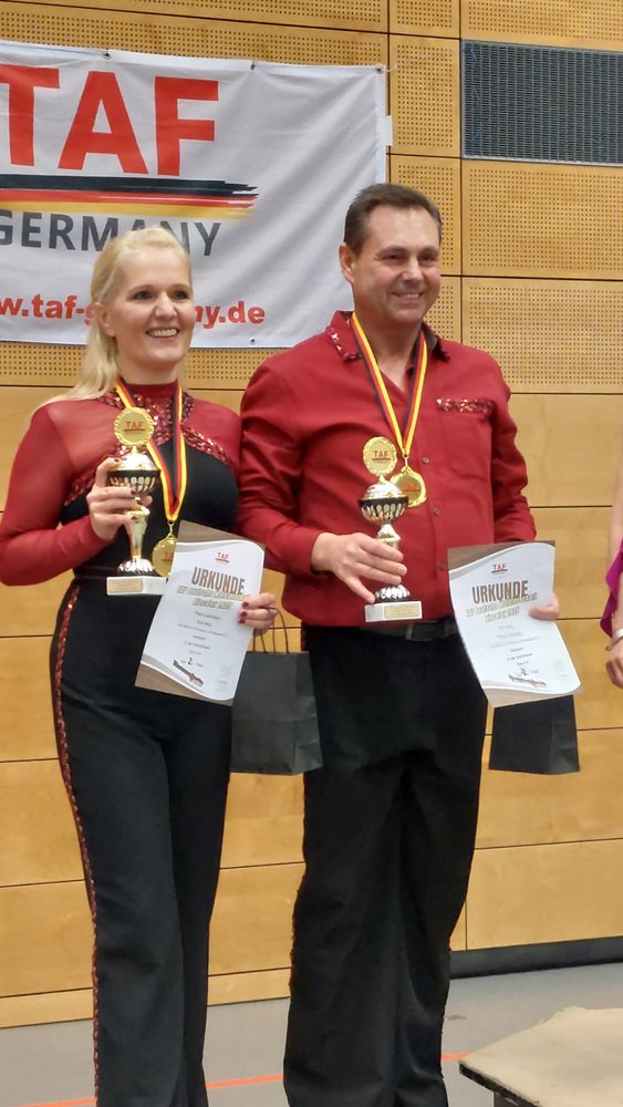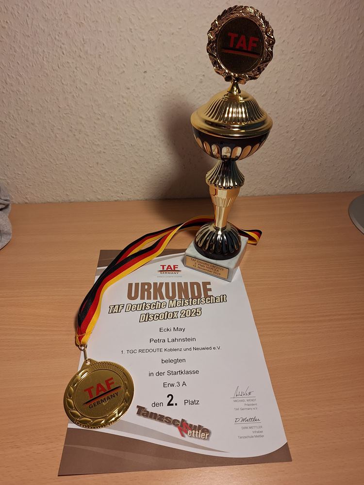 Wie fühlt es sich an, an einem grauen Novembertag aufzuwachen und auf einen großen Pokal zu blicken? GROSSARTIG! Sagen jedenfalls Petra Lahnstein aus Molsberg und Ecki May aus Neuwied, die beim TGC Redoute Koblenz und Neuwied e.V. trainieren. Die beiden haben bei der Deutschen Meisterschaft im Discofox (TAF) in der Klasse A3 den 2. Platz belegt. Und den Pokal mit nach Hause genommen.