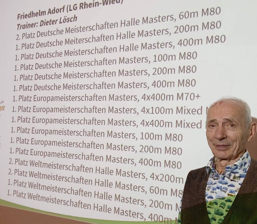 Unter den zu Ehrenden befand sich mit Friedhelm Adorf (LG Rhein-Wied/ASG Altenkirchen), der Top Masters Athlet des Abends, der in diesem Jahr bei Deutschen- Europa- und Weltmeisterschaften in Stadion und Halle nochmal richtig zugeschlagen hatte. Bei den Hallenweltmeisterschaften, die im März in Florida/USA ausgetragen wurden, holte Adorf 1X Gold, 2x Silber und 1x Bronze. Den Vogel schoss Adorf, der in der Altersklasse M80 startet, dann jedoch bei der Masters EM in Madeira ab, wo er gleich sechs Titel abräumte! Zunächst lief er die 400 m in 75,41 Sekunden. Es folgte der 100 m Lauf in 15,01 Sekunden. Danach folgte der 200 m Lauf in 30,15 Sekunden. Im Vorlauf lief er mit 30,02 Sekunden einen neuen Europarekord! Außerdem folgten noch die EM -Titel und Goldmedaillen in den Staffeln über 4×100 m, 4×400 m und 4×400 m Mixed. Außerdem gewann Adorf bei Deutschen Meisterschaften in Halle und Stadion noch folgende Medaillen und Titel: Deutsche Hallenmeisterschaften in Frankfurt: Gold über 400 m und Silber über 60 m. Deutsche Meisterschaften in Gotha: Gold über 100 m, 200 m und 400 m