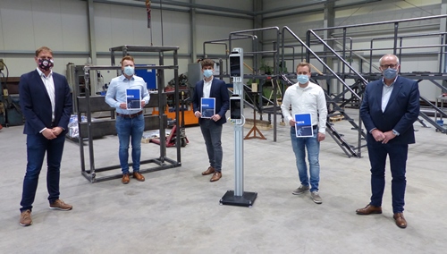 KREIS ALTENKIRCHEN – BETZDORF – Unternehmen entwickeln gemeinsam innovative Zugangskontrolle – Mit Innovationsgeist und Flexibilität haben drei Unternehmen aus der Region auf die Corona-Krise reagiert: Das Metallbauunternehmen ms-Industrieservice aus Betzdorf, die Wezek Service GmbH aus Leverkusen, die zur Wezek GmbH in Steinebach gehört, sowie das Siegener Start-up NeurologIQ haben in kurzer Zeit eine modulare Zugangskontrolle für Personen in Gebäuden entwickelt. Landrat Dr. Peter Enders und Lars Kober, Leiter der Wirtschaftsförderung Kreis Altenkirchen, durften sich das Gerät vor Ort in den neuen Hallen der Firma Schäfer ms-Industrieservice näher anschauen und selbst testen.„Nur wenige Monate nach dem Umzug unseres Unternehmens von Scheuerfeld nach Betzdorf kam mit Corona die nächste große Herausforderung“, berichtete Michael Schäfer, Gründer und Geschäftsführer von ms-Industrieservice. Doch für ihn und seine Söhne Manuel und Marcel war dies kein Grund, den Kopf in den Sand zu stecken. Sohn Manuel entwickelte gemeinsam mit Marvin Werder, Geschäftsführer der Wezek Service GmbH und Projektleiter der Wezek GmbH, und Simon Sack, Gründer des Start-Up NeurologIQ (Siegen), die Vorrichtung Modular Entry Control System (MECS). Dabei handelt es sich um eine stationäre Zugangskontrolle, mit welcher in kürzester Zeit die menschliche Körpertemperatur gemessen wird, Gesichter auf das Vorhandensein eines Mund-Nasen-Schutzes gescannt und Personen gezählt werden können.