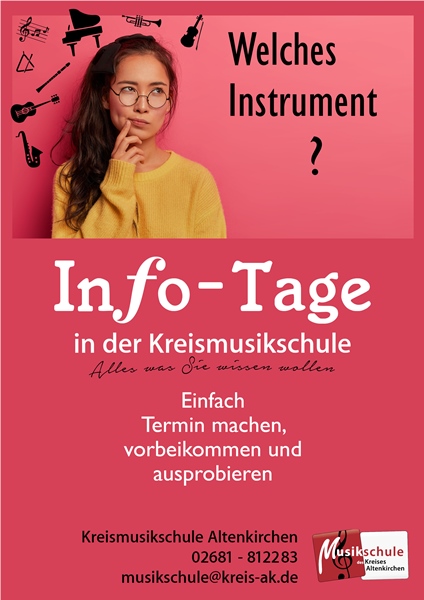 Die Musikschule des Kreises Altenkirchen lädt auch in diesem Jahr zu Infotagen in ihre Unterrichtsstätten im Kreisgebiet! Bis zu den Sommerferien können alle Kinder, Jugendlichen und sonstigen Interessenten ihren individuellen, kostenlosen Beratungs- und Probiertermin vereinbaren, um ihr Wunschinstrument zu testen.