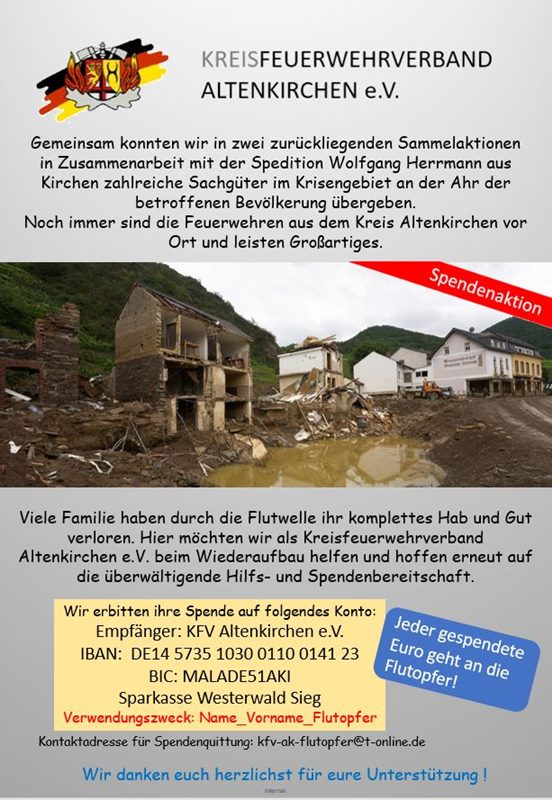 KREIS ALTENKIRCHEN – Kreisfeuerwehrverband ruft zu Geldspenden für Flutopfer auf.