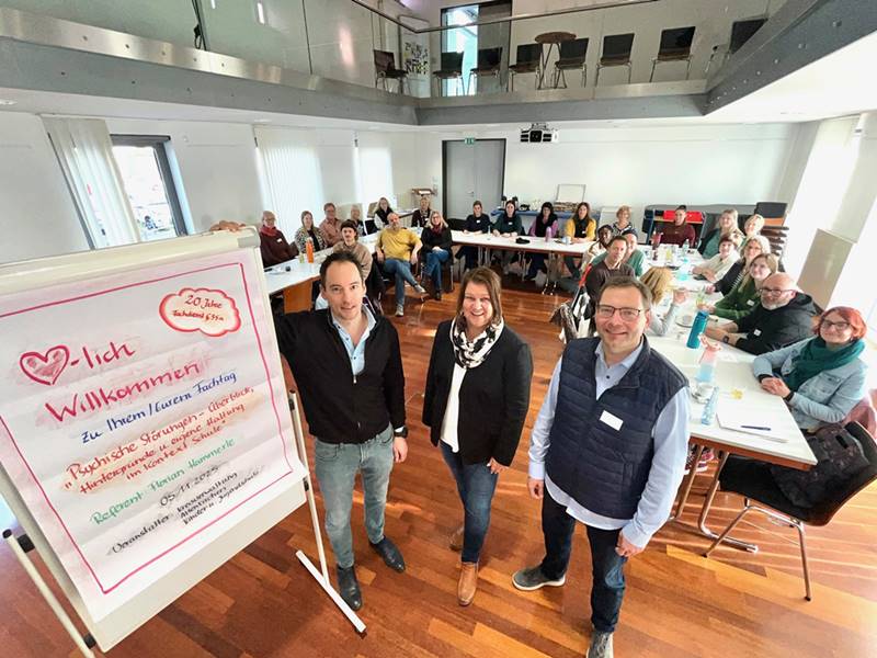 Hammerle ging im ersten (theoretischen) Teil zunächst auf die Fragen ein, was eine psychische Störung überhaupt ausmacht, welche verschiedenen Formen es gibt und wie Leidensdruck und Nachteile im Leben auf Kinder und Jugendliche so stark wirken, dass am Ende unter Umständen die Schulunfähigkeit steht. Zudem stellte der Psychologe das novellierte Diagnosesystem vor, das nun u.a. eine andere Alterseinstufung bei ADHS enthält sowie komplexere Traumata und auch Störungen wie Essattacken berücksichtigt. Es folgte am Nachmittag eine praxisbezogene Reflexion der eigenen Haltung mit Tipps zu konkreten Handlungsmöglichkeiten.