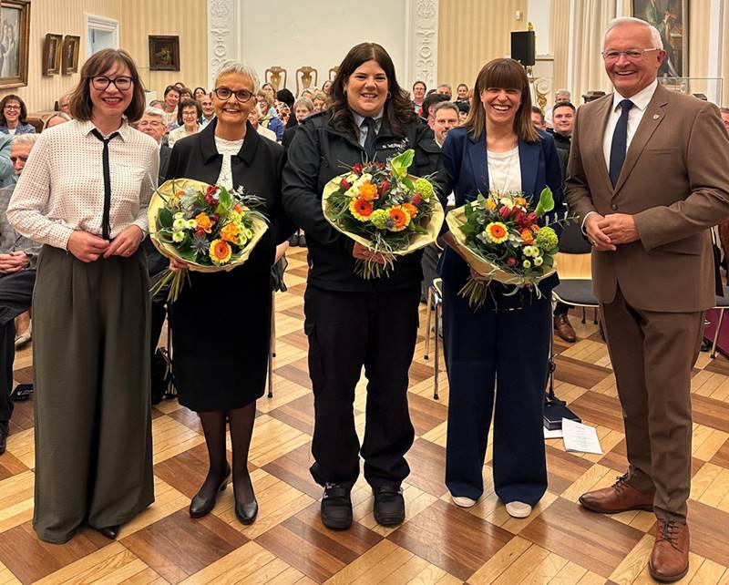 Im großen Festsaal des Roentgen-Museums Neuwied hat Landrat Achim Hallerbach die diesjährigen Johanna-Loewenherz-Preise zusammen mit der Kreis-Gleichstellungsbeauftragten Daniela Kiefer an Schwester Edith Maria Magar, Dr. Julia Reuschenbach und Nicole Werner verliehen.