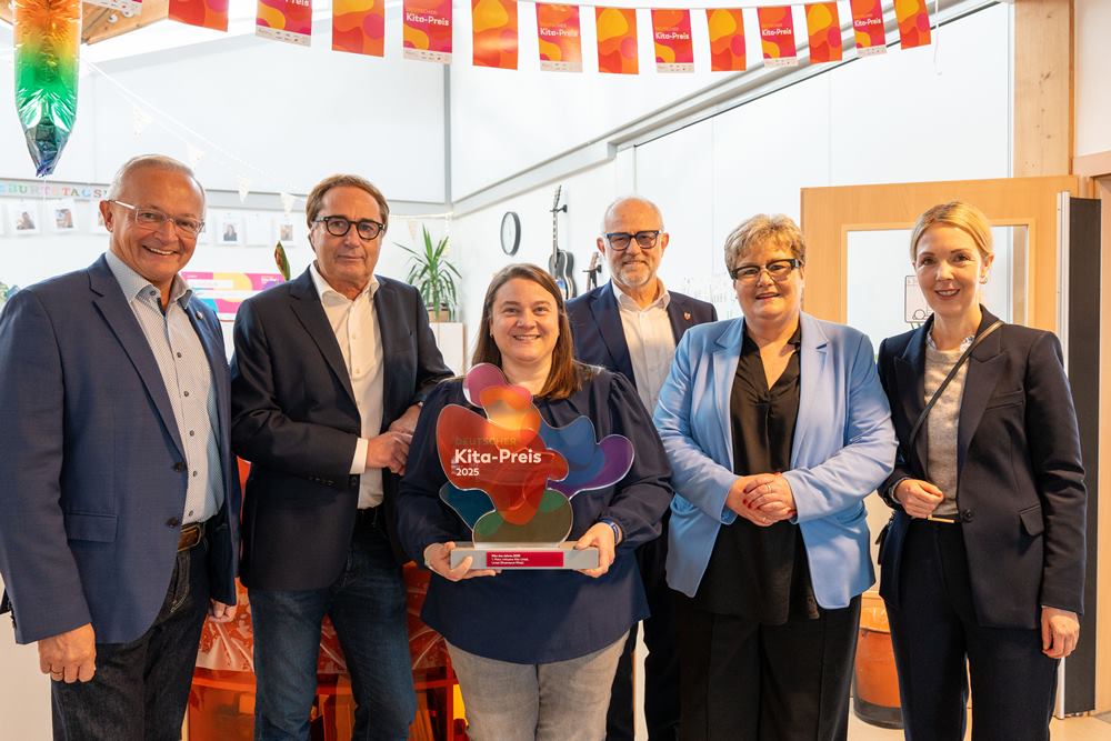 Foto: Gemeinsam mit der Staatssekretärin im rheinland-pfälzischen Bildungsministerium, Bettina Brück, der Bundestagsabgeordneten Ellen Demuth, Stadtbürgermeister Alfons Mußhoff und dem Geschäftsführer des gemeinnützigen Betreibergesellschaft HTZ Neuwied, Thomas Voß, gratulierte Landrat Achim Hallerbach der inklusiven städtischen Kita Unkel und Leiterin Claudia Gries zum Titel „Beste Kita des Jahres 2025 in ganz Deutschland“. Foto: Martin Boden / Kreisverwaltung Neuwied