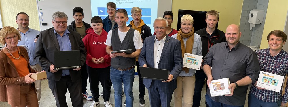 Foto: Landrat Achim Hallerbach und Kreis-Beigeordneter Michael Mahlert (jeweils mit Latop) sowie die stellvertretende Leiterin der Schulabteilung des Kreises (links) und der Digital-Beauftragte Karsten Rodigast (7. von links) freuen sich mit Schülern und Lehrern über die Verbesserung der technischen Ausstattung.