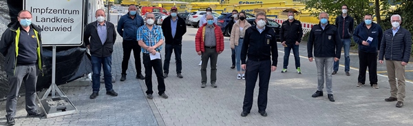 Foto: Brand- und Katastrophenschutz-Inspekteur Holger Kurz (Mitte), Landrat Achim Hallerbach (4. von rechts), Puderbachs Bürgermeister Volker Mendel (rechts) und Impfkoordinator Matthias Blum (3. von rechts) freuen sich, den Feuerwehrleuten im Kreis Neuwied ein kurzfristiges Impfangebot machen zu können. Das Foto entstand Pfingstsonntag, als im Rahmen der ersten Sonderaktion insgesamt rund 100 Wehrleute in Oberhonnefeld geimpft wurden.
