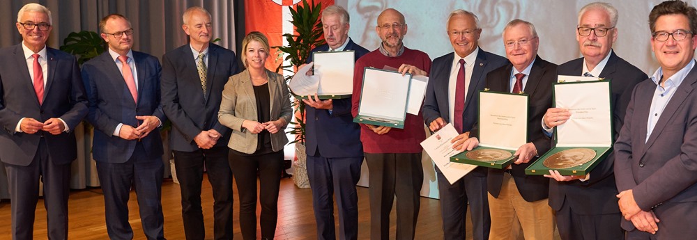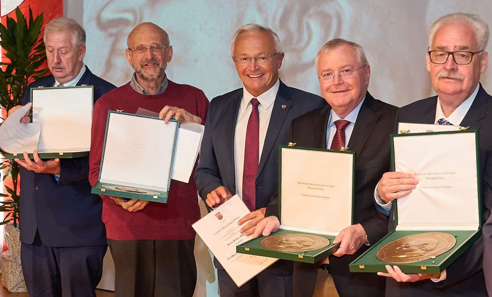 Alle drei Jahre verleiht das rheinland-pfälzische Innenministerium die Freiherr-vom-Stein-Plakette an verdiente Kommunalpolitiker, „die sich in ehrenamtlicher Tätigkeit besondere Verdienste in der kommunalen Selbstverwaltung erworben haben“. Aus dem Kreis Neuwied hat Minister Roger Lewentz in diesem Jahr vier Männer mit dieser hohen Auszeichnung geehrt: Neuwieds früheren Bürgermeister Reiner Kilgen, Dernbachs Ortsbürgermeister Heinz Rudolf Becker, St. Katharinens Ortsbürgermeister Willi Knopp sowie Helmut Hellwig aus Puderbach. „Das ist ganz ohne Zweifel eine verdiente Anerkennung für jahrzehntelange Arbeit in den verschiedenen Gremien“, gratuliert Achim Hallerbach als Landrat des Kreises Neuwied und macht deutlich: „Wir brauchen Menschen wie die vier Geehrten. Sonst funktionieren unsere Demokratie und unser gesellschaftlicher Zusammenhalt nicht. Ich kann nur an alle Mitbürger aus unserem Kreis appellieren, sich kommunalpolitisch zu engagieren.“